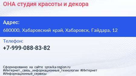 ОНА, студия красоты и декора по адресу 680000, Хабаровский край, Хабаровск, Гайдара, 12 в дальнейшем Организация, размещена в следующих категориях: