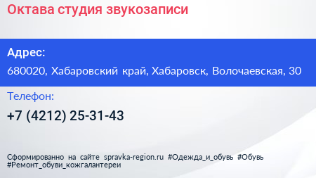 Октава, студия звукозаписи по адресу 680020, Хабаровский край, Хабаровск, Волочаевская, 30 в дальнейшем Организация, размещена в следующих категориях: