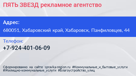 ПЯТЬ ЗВЕЗД, рекламное агентство по адресу 680051, Хабаровский край, Хабаровск, Панфиловцев, 44 в дальнейшем Организация, размещена в следующих категориях: