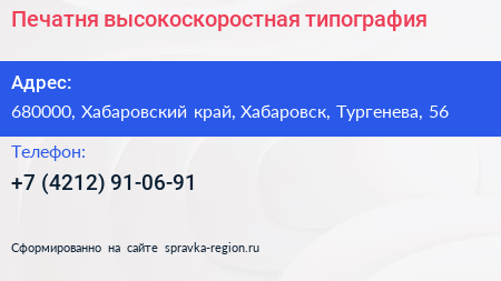 Печатня, высокоскоростная типография по адресу 680000, Хабаровский край, Хабаровск, Тургенева, 56 в дальнейшем Организация, размещена в следующих категориях: