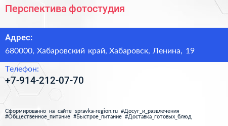 Перспектива, фотостудия по адресу 680000, Хабаровский край, Хабаровск, Ленина, 19 в дальнейшем Организация, размещена в следующих категориях:
