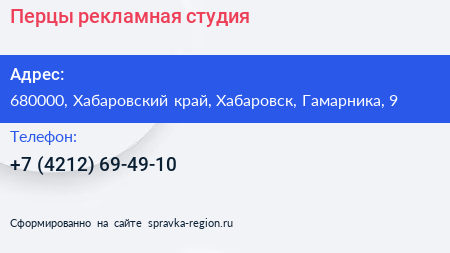 Перцы, рекламная студия по адресу 680000, Хабаровский край, Хабаровск, Гамарника, 9 в дальнейшем Организация, размещена в следующих категориях: