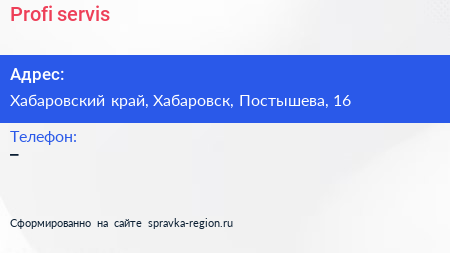 Profi-servis по адресу Хабаровский край, Хабаровск, Постышева, 16 в дальнейшем Организация, размещена в следующих категориях: