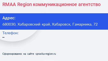 RMAA Region, коммуникационное агентство по адресу 680030, Хабаровский край, Хабаровск, Гамарника, 72 в дальнейшем Организация, размещена в следующих категориях: