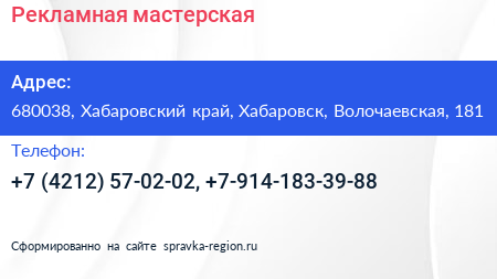 Рекламная мастерская по адресу 680038, Хабаровский край, Хабаровск, Волочаевская, 181 в дальнейшем Организация, размещена в следующих категориях: