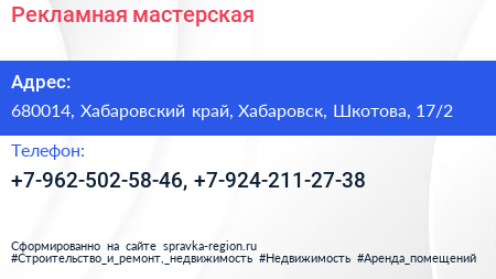 Рекламная мастерская по адресу 680014, Хабаровский край, Хабаровск, Шкотова, 17/2 в дальнейшем Организация, размещена в следующих категориях: