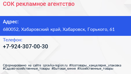 СОК, рекламное агентство по адресу 680052, Хабаровский край, Хабаровск, Горького, 61 в дальнейшем Организация, размещена в следующих категориях: