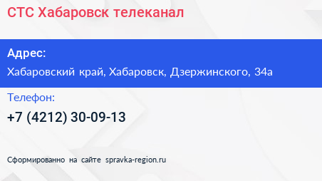 СТС-Хабаровск, телеканал по адресу Хабаровский край, Хабаровск, Дзержинского, 34а в дальнейшем Организация, размещена в следующих категориях: