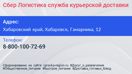 Сбер Логистика, служба курьерской доставки по адресу Хабаровский край, Хабаровск, Гамарника, 12 в дальнейшем Организация, размещена в следующих категориях: