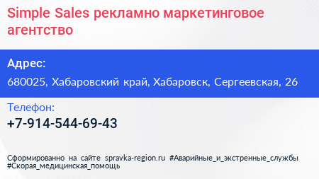 Simple Sales, рекламно-маркетинговое агентство по адресу 680025, Хабаровский край, Хабаровск, Сергеевская, 26 в дальнейшем Организация, размещена в следующих категориях: