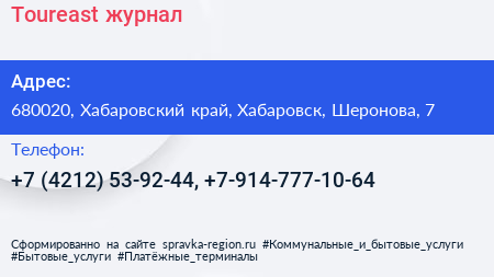 Toureast, журнал по адресу 680020, Хабаровский край, Хабаровск, Шеронова, 7 в дальнейшем Организация, размещена в следующих категориях:
