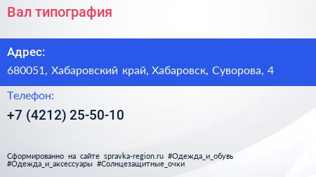 Вал, типография по адресу 680051, Хабаровский край, Хабаровск, Суворова, 4 в дальнейшем Организация, размещена в следующих категориях:
