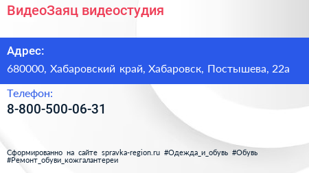 ВидеоЗаяц, видеостудия по адресу 680000, Хабаровский край, Хабаровск, Постышева, 22а в дальнейшем Организация, размещена в следующих категориях: