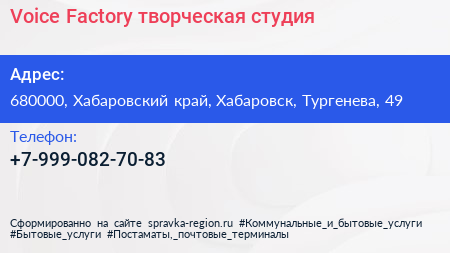 Voice Factory, творческая студия по адресу 680000, Хабаровский край, Хабаровск, Тургенева, 49 в дальнейшем Организация, размещена в следующих категориях: