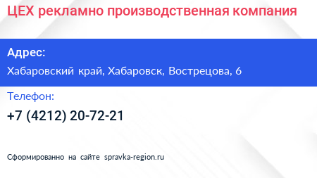ЦЕХ, рекламно-производственная компания по адресу Хабаровский край, Хабаровск, Вострецова, 6 в дальнейшем Организация, размещена в следующих категориях: