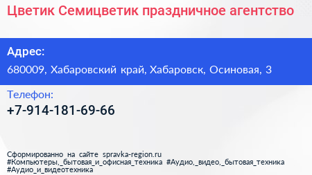 Цветик-Семицветик, праздничное агентство по адресу 680009, Хабаровский край, Хабаровск, Осиновая, 3 в дальнейшем Организация, размещена в следующих категориях: