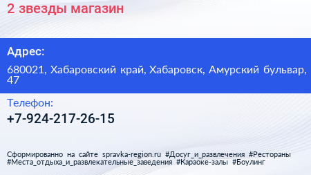 2 звезды, магазин по адресу 680021, Хабаровский край, Хабаровск, Амурский бульвар, 47 в дальнейшем Организация, размещена в следующих категориях: