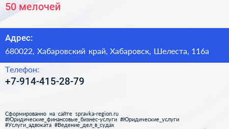 50 мелочей по адресу 680022, Хабаровский край, Хабаровск, Шелеста, 116а в дальнейшем Организация, размещена в следующих категориях: