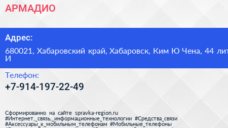 АРМАДИО по адресу 680021, Хабаровский край, Хабаровск, Ким Ю Чена, 44 лит И в дальнейшем Организация, размещена в следующих категориях: