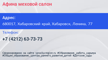 Афина, меховой салон по адресу 680017, Хабаровский край, Хабаровск, Ленина, 77 в дальнейшем Организация, размещена в следующих категориях: