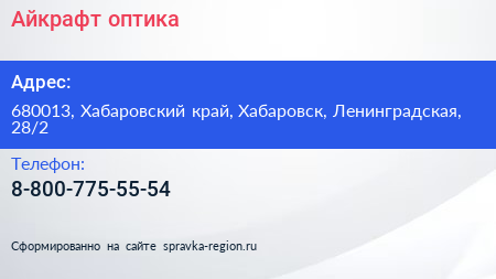 Айкрафт, оптика по адресу 680013, Хабаровский край, Хабаровск, Ленинградская, 28/2 в дальнейшем Организация, размещена в следующих категориях: