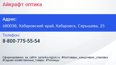 Айкрафт, оптика по адресу 680038, Хабаровский край, Хабаровск, Серышева, 25 в дальнейшем Организация, размещена в следующих категориях: