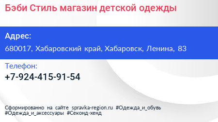 Бэби Стиль, магазин детской одежды по адресу 680017, Хабаровский край, Хабаровск, Ленина, 83 в дальнейшем Организация, размещена в следующих категориях: