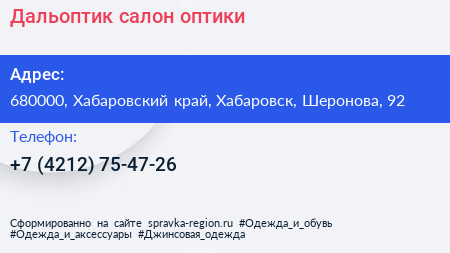 Дальоптик, салон оптики по адресу 680000, Хабаровский край, Хабаровск, Шеронова, 92 в дальнейшем Организация, размещена в следующих категориях: