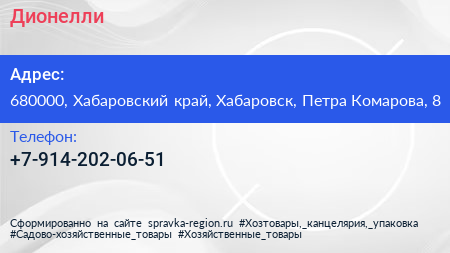 Дионелли по адресу 680000, Хабаровский край, Хабаровск, Петра Комарова, 8 в дальнейшем Организация, размещена в следующих категориях:
