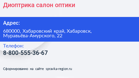 Диоптрика, салон оптики по адресу 680000, Хабаровский край, Хабаровск, Муравьёва-Амурского, 22 в дальнейшем Организация, размещена в следующих категориях: