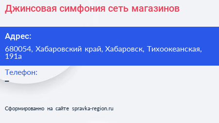 Джинсовая симфония, сеть магазинов по адресу 680054, Хабаровский край, Хабаровск, Тихоокеанская, 191а в дальнейшем Организация, размещена в следующих категориях: