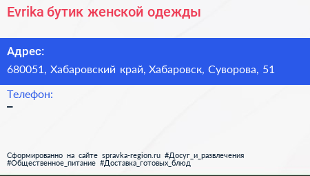 Evrika, бутик женской одежды по адресу 680051, Хабаровский край, Хабаровск, Суворова, 51 в дальнейшем Организация, размещена в следующих категориях: