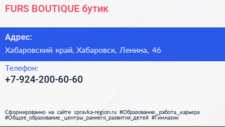 FURS BOUTIQUE, бутик по адресу Хабаровский край, Хабаровск, Ленина, 46 в дальнейшем Организация, размещена в следующих категориях: