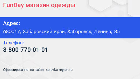 FunDay, магазин одежды по адресу 680017, Хабаровский край, Хабаровск, Ленина, 85 в дальнейшем Организация, размещена в следующих категориях: