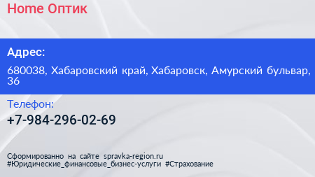 Home Оптик по адресу 680038, Хабаровский край, Хабаровск, Амурский бульвар, 36 в дальнейшем Организация, размещена в следующих категориях: