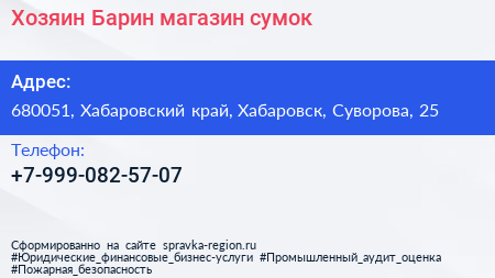 Хозяин Барин, магазин сумок по адресу 680051, Хабаровский край, Хабаровск, Суворова, 25 в дальнейшем Организация, размещена в следующих категориях: