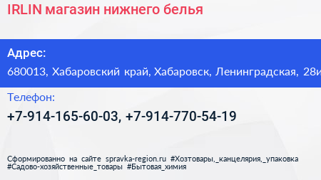 IRLIN, магазин нижнего белья по адресу 680013, Хабаровский край, Хабаровск, Ленинградская, 28и в дальнейшем Организация, размещена в следующих категориях: