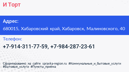 И.Торт по адресу 680015, Хабаровский край, Хабаровск, Малиновского, 40 в дальнейшем Организация, размещена в следующих категориях: