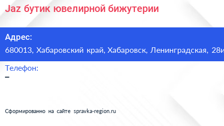 Jaz, бутик ювелирной бижутерии по адресу 680013, Хабаровский край, Хабаровск, Ленинградская, 28и в дальнейшем Организация, размещена в следующих категориях: