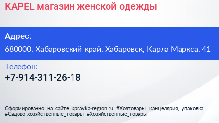 KAPEL`, магазин женской одежды по адресу 680000, Хабаровский край, Хабаровск, Карла Маркса, 41 в дальнейшем Организация, размещена в следующих категориях: