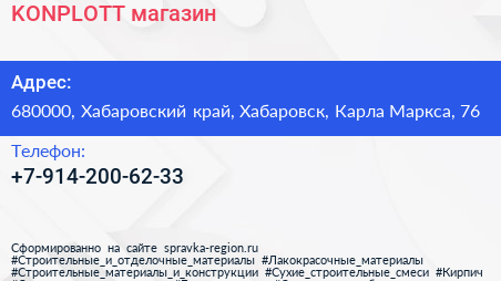 KONPLOTT, магазин по адресу 680000, Хабаровский край, Хабаровск, Карла Маркса, 76 в дальнейшем Организация, размещена в следующих категориях: