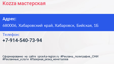 Kozza, мастерская по адресу 680006, Хабаровский край, Хабаровск, Бийская, 1Б в дальнейшем Организация, размещена в следующих категориях:
