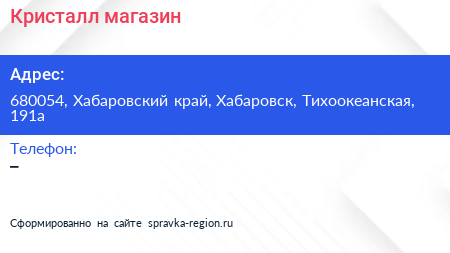 Кристалл, магазин по адресу 680054, Хабаровский край, Хабаровск, Тихоокеанская, 191а в дальнейшем Организация, размещена в следующих категориях: