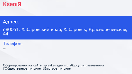 KseniЯ по адресу 680051, Хабаровский край, Хабаровск, Краснореченская, 44 в дальнейшем Организация, размещена в следующих категориях:
