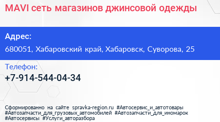 MAVI, сеть магазинов джинсовой одежды по адресу 680051, Хабаровский край, Хабаровск, Суворова, 25 в дальнейшем Организация, размещена в следующих категориях: