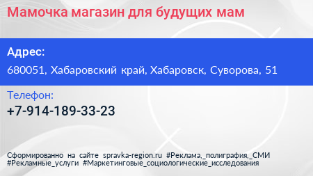 Мамочка, магазин для будущих мам по адресу 680051, Хабаровский край, Хабаровск, Суворова, 51 в дальнейшем Организация, размещена в следующих категориях: