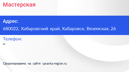 Мастерская по адресу 680022, Хабаровский край, Хабаровск, Вяземская, 26 в дальнейшем Организация, размещена в следующих категориях: