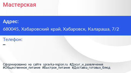 Мастерская по адресу 680045, Хабаровский край, Хабаровск, Калараша, 7/2 в дальнейшем Организация, размещена в следующих категориях: