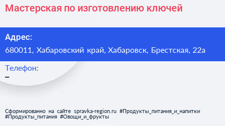 Мастерская по изготовлению ключей по адресу 680011, Хабаровский край, Хабаровск, Брестская, 22а в дальнейшем Организация, размещена в следующих категориях: