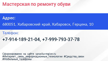 Мастерская по ремонту обуви по адресу 680051, Хабаровский край, Хабаровск, Герцена, 10 в дальнейшем Организация, размещена в следующих категориях: